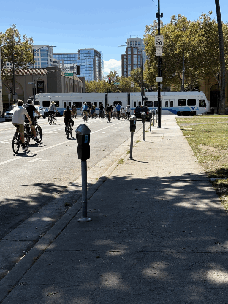 Bikers stop for a VTA Light Rail during Viva Calle in September, 2025